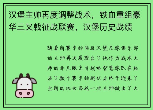 随着新赛季的临近,汉堡足球俱乐部的主帅再次展现出了他作为战术大师的非凡眼光与战略智慧。球队在经历了数个赛季的起伏后,终于迎来了全新的机会。而这一次,主帅做出了大胆的战术调整,尤其是针对锋线的重组,形成了如今被媒体和球迷们高度期待的“豪华三叉戟”阵容。这一决策不仅展现了汉堡对未来的雄心壮志,更让球迷们充满了信心,期待在接下来的联赛中看到更加出色的表现。